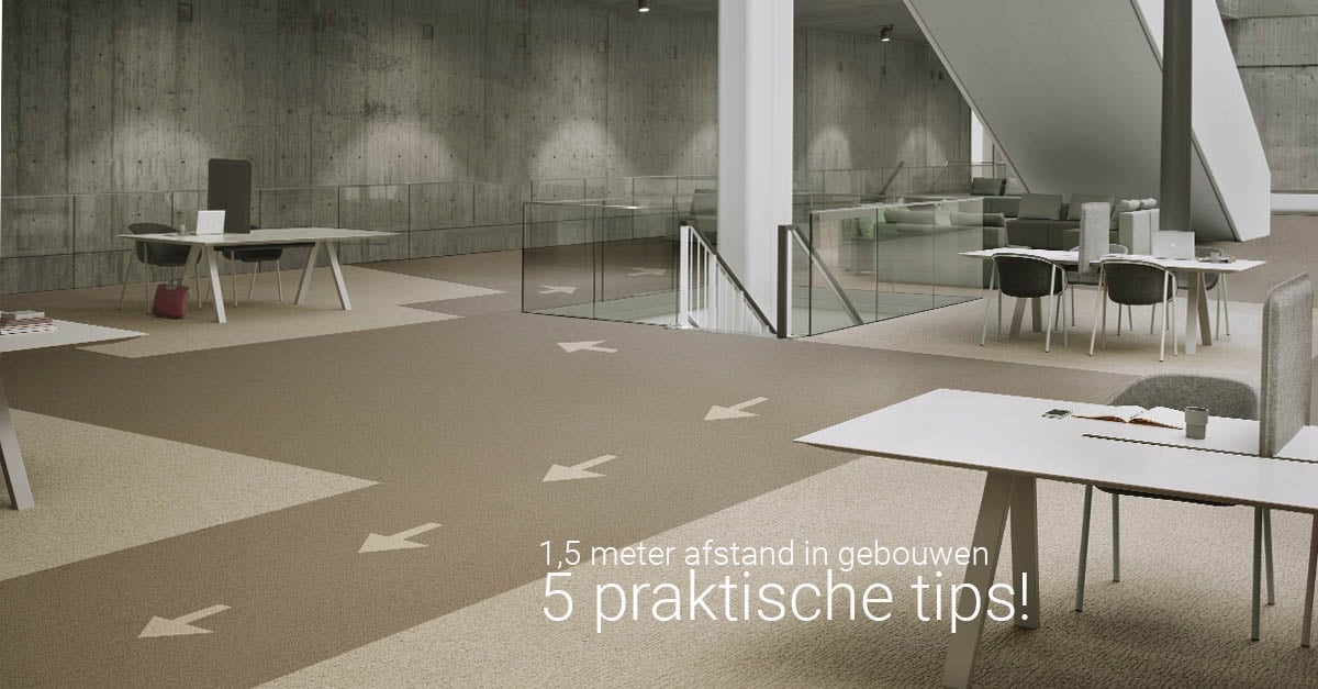 Hoewel thuiswerken velen goed bevallen is dankzij alle digitale mogelijkheden, blijft menselijke interactie absoluut waardevol. Wel zijn afstandsmaatregelen van belang bij het terugkeren naar gebouwen. Pas de inrichting in gebouwen aan op de 1,5 meter-economie. Dit kan door meubilair (verder) uit elkaar te plaatsen en het aantal plaatsen te verminderen in bijvoorbeeld kantoren, restaurants en spreekkamers. Ook kan worden nagedacht over spreiding : laat thuiswerken toe of spreid lunchtijden om wachtrijen in het bedrijfsrestaurant te voorkomen. Verder kunnen waar nodig plexiglasschermen geplaatst worden, zoals bij de kassa en bij de receptie.